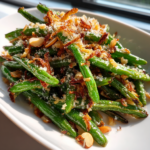 Imagine biting into a crispy green bean that has a soft, tender center, encased in a perfectly seasoned crisp coating. The vibrant green color of the beans shines through, enhanced by a sprinkle of toppings that could include golden Parmesan, crunchy fried onions, or nutty almonds. The taste is a delightful combination of savory, nutty, and slightly salty, as your taste buds dance with excitement at every crunch.
