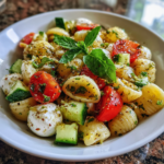 - In a large bowl, combine the halved cherry tomatoes, diced cucumber, cooked pasta, and mozzarella balls.