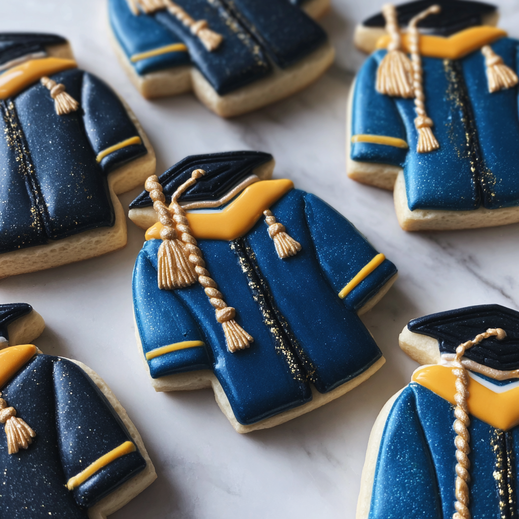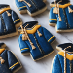 Graduation gown cookies are creatively designed sugar cookies that mimic the appearance of graduation gowns. These cookies are typically decorated using royal icing to create vibrant colors and detailed designs. The addition of black fondant simulates the gown’s fabric, while touches of edible luster dust add an elegant finish. Perfect for graduation parties, these cookies are a delightful way to celebrate your achievement.
