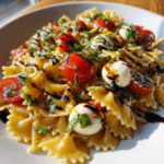 Summer Pasta Salad is a chilled dish typically made with cooked pasta, fresh vegetables, and a dressing, often served as a side or main dish. The ingredients can vary widely based on personal preferences, dietary restrictions, and seasonal availability, making it a flexible and adaptable meal option.